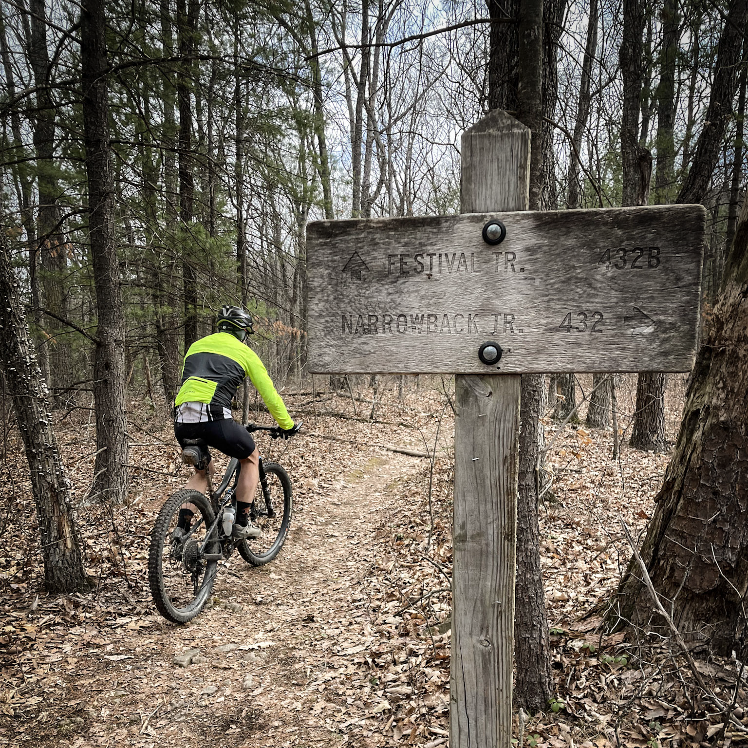 Ride the Narrowback West Trail up a series of smooth switchbacks to a four-way junction (2.1 miles). Continue on the Narrowback West Trail. Follow signs to the Tower Trail – 432A and ride along the ridge through rocky areas. Turn right onto the Tillman West Trail – 439 (3.3 miles) a two-mile, flowy track. Cross Big Run Creek at the bottom of the mountain and turn right onto Tilghman Rd (5.4 miles). Head north and turn right onto Dog Graves Road. A dog graveyard with headstones can be seen from the trail. Climb the mile-long doubletrack back up to the Narrowback West Trail. Turn left onto the trail and enjoy its smooth grades. Return to the parking area.