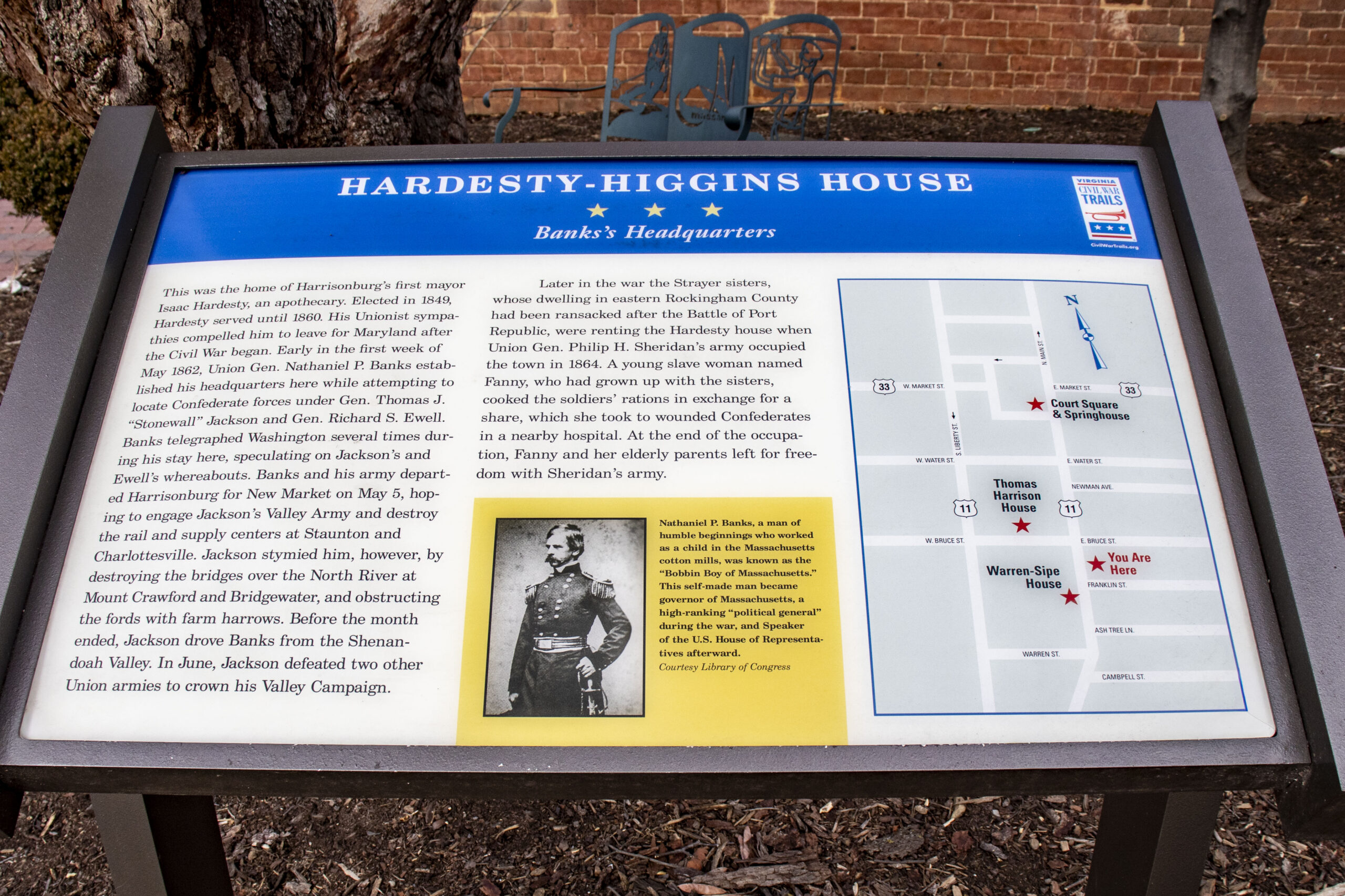 This Trails sign is located on South Main Street between Bruce and Franklin streets in Harrisonburg. Home to the town’s first mayor, Isaac Hardesty, this house was used briefly as headquarters for Union Gen. Nathaniel Banks as he tried to corner Stonewall Jackson in 1862. Located within the Hardesty-Higgins House Visitor Center, visitors will find The Valley Turnpike Museum and the Harrisonburg Rockingham Civil War Orientation Center. The Valley Turnpike Museum highlights the history of the Rt. 11 corridor as the avenue of invasion and the events surrounding it. The museum also has a scale model recreation of 1862 Harrisonburg and engine 199 on display. The Civil War Orientation Center offers visitors the stories of individuals, battles and campaigns through film and interpretation.